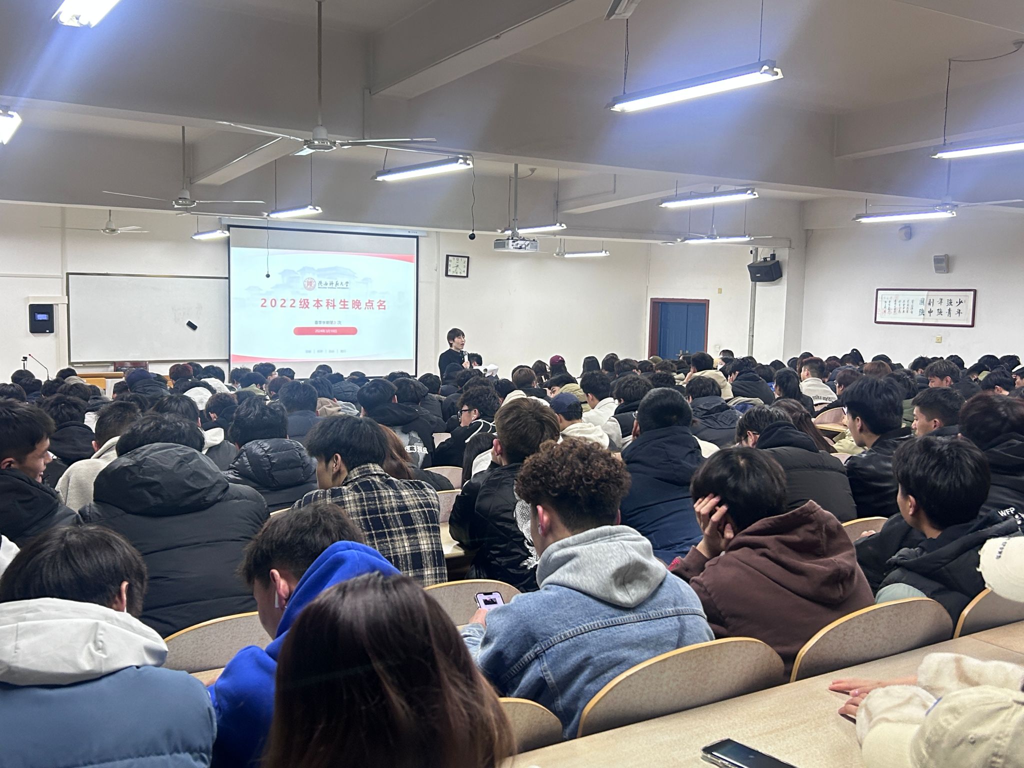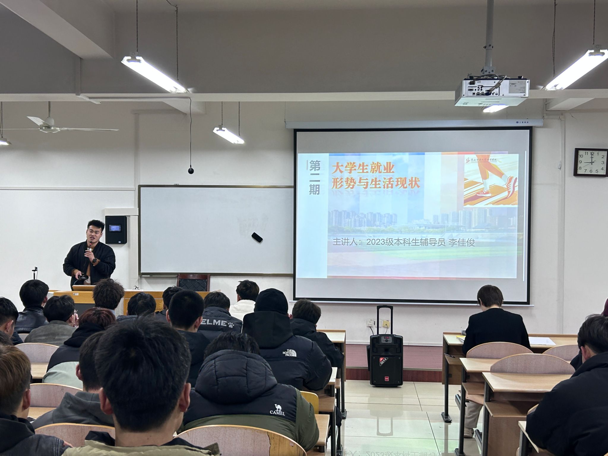 3月10日,在2022级本科生的晚间点名课堂上,体能加油站第二期如火如荼的进行。在常规点名以及重要事项通知后,张媚老师为大家介绍了本期分享主题:老员工就业形势与生活现状,本期分享嘉宾为2023级员工辅导员、校级就业先进个人李佳俊老师。
