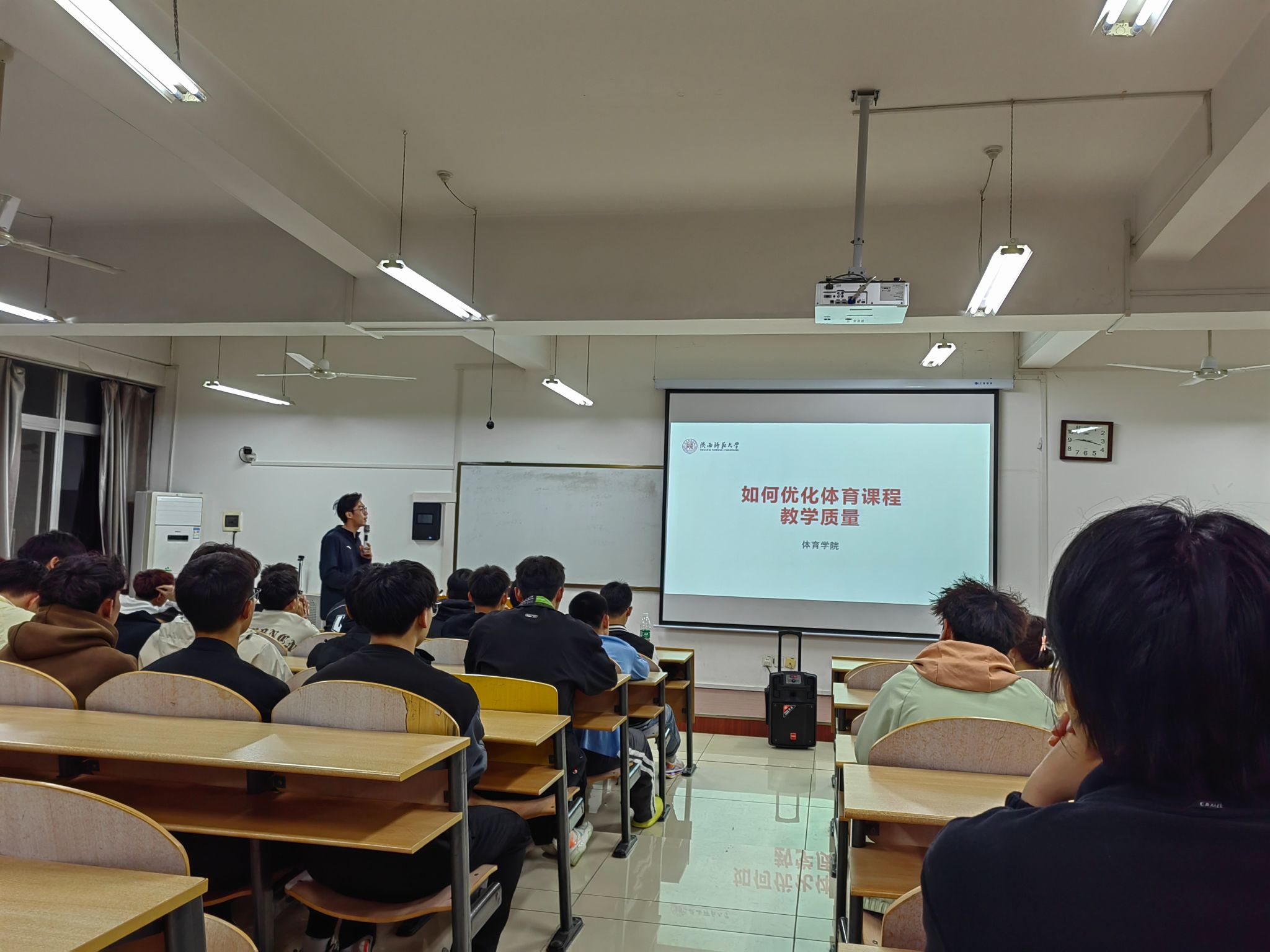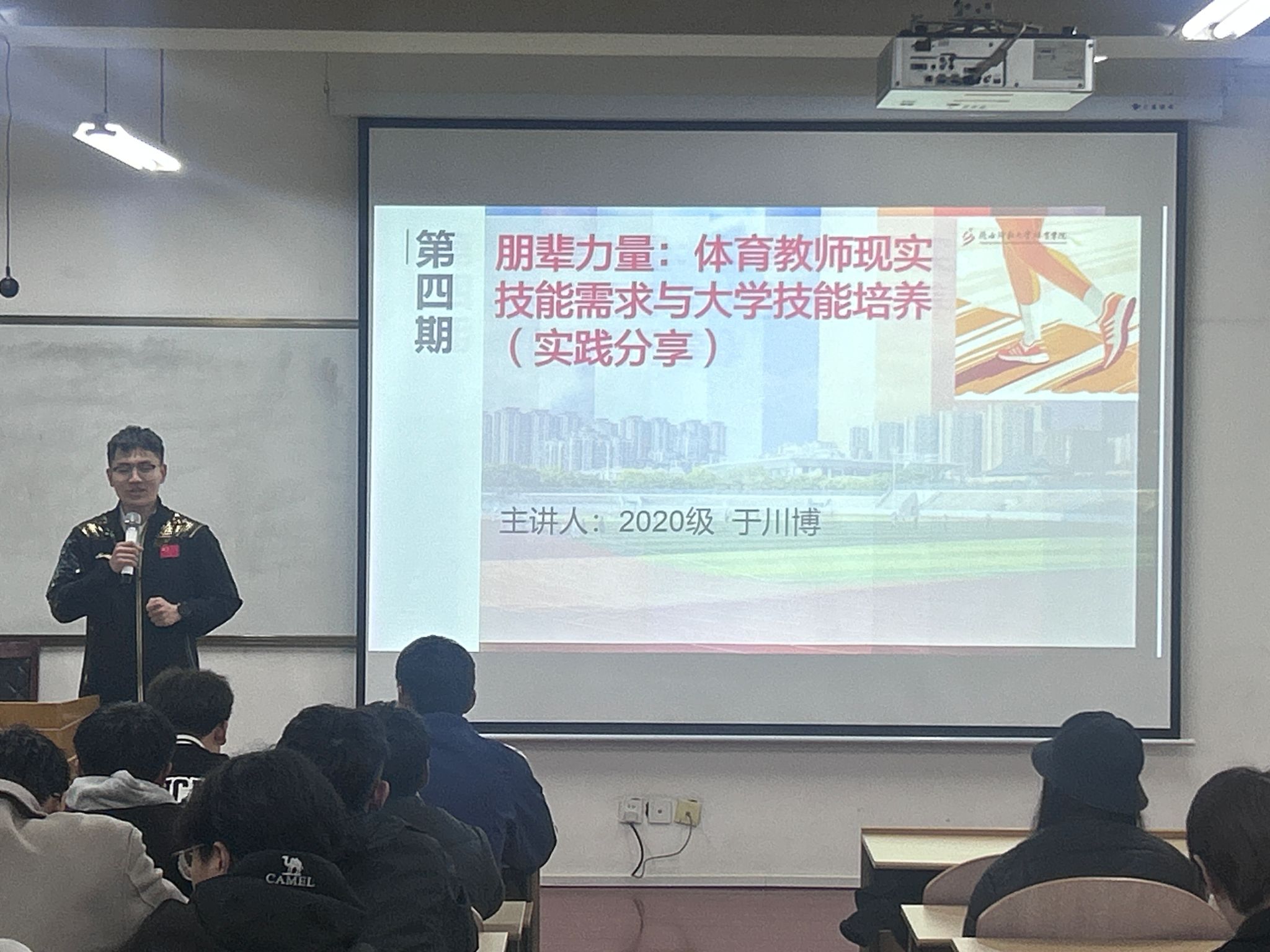 两位学长以“朋辈力量:就业实践技能—如何优化体育课程教学质量”为主题,从自身实习与实践经历、中学体育课程现状、大学课程设置、靶向性学习与实践锻炼等内容与同学们作以经验分享。