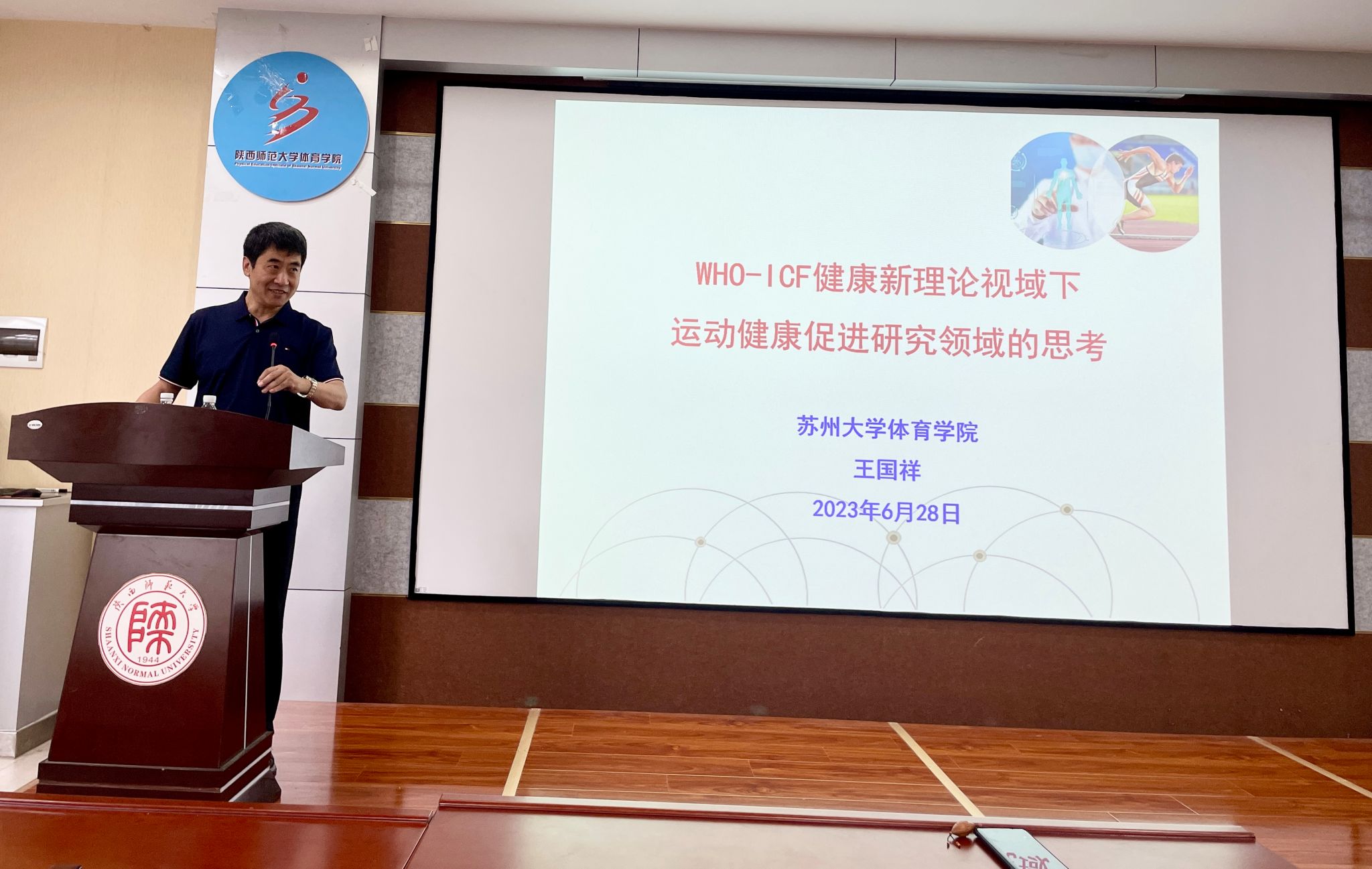 上午9时,第一场讲座开幕,王国祥教授重点介绍了WHO-ICF 健康新理论视城下运动健康促进研究领域的发展趋势。谈到运动健康,王教授结合自身的科研学术研究和不同学术角度的举例认证,就世界卫生组织对健康的定义、怎样正确认识社会健康、什么是“健康中国”目标,什么是健康服务连续体、怎样才能实现体育健康促进目标的功能最大化等观点为指引展开学术分享。一场精彩的学术讲座使同学们重新认识健康、重新认识疾病、重新认识康复,重新认识运动。让参会师生对健康有了更深的了解和认识,同时也开拓了同学们进行科学研究的新理念、新思路、新方法。