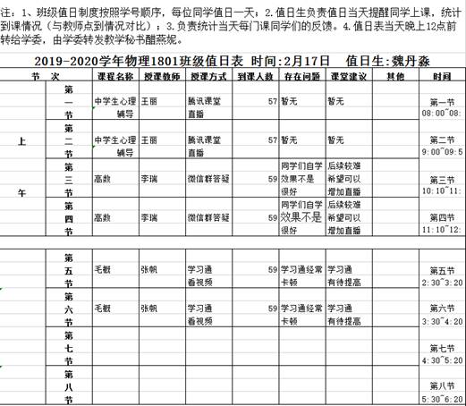 为了了解员工每天的上网课具体情况,设计班级值日表,建立班级值日制度,值日生负责提醒当日上课时间,提前联系教师,课后填写值日表,反馈上课情况。