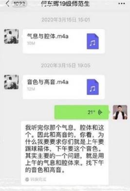 手机录音视频打卡一对一教学模式,不仅老师与员工每天能进行互动交流,及时的发现员工每天演唱的优缺点,并加以改正,还能督促员工每天都能进行歌唱状态的训练,培养员工主动学习与自律性,员工通过老师的纠正与方法的调整,再一次听录音进行分析与演唱,这种教学方式也避免了员工一周只有一周专业课的情况下,也能每天学习,还能解决平时偷懒不练习,更重要的是疫情期间,员工通过这种学习“打卡”的方式,随时汇报健康情况!