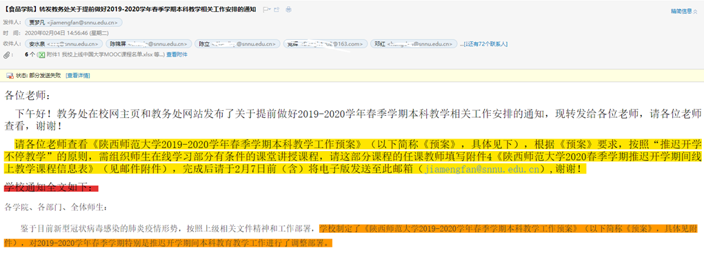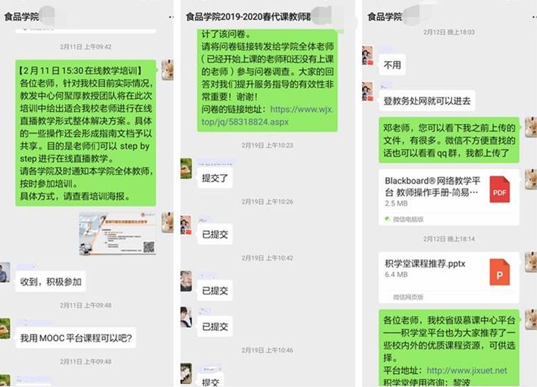开展线上教学前,通过微信、qq群、邮件等形式,沟通讨论开学前的教学准备工作,向教师和员工及时传达学校的相关文件和重要精神,及时准确地填报各类开课信息表、教师拟采用的开课形式等信息,保证各类教学平台的顺利搭建,做好开课准备,帮助员工进入课程群。同时,耐心解答教师和员工关于延迟开学、远程上课等事宜的各种疑问,积极协调沟通,让员工在家也能安心学习,为教与学提供有效保障。新的模式给了我们新的挑战,最初建课时,每天从早到晚电话微信qq响个不停,有各种各样的问题,渐渐地在教务处、学院老师们和兄弟院系教学秘书的支持下,通过大家的共同努力,克服了种种困难,顺利展开线上教学。