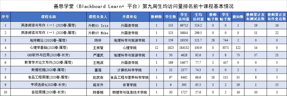 依托陕西省MOOC中心陕西师大分中心善思学堂(陕西师大本科课程平台)(以下简称“陕西师大善思学堂”)开展在线教学课程511门次。每门课程平均访问量1717人次。其中本周员工人均访问量排名第一的课程为外国语学院外籍教师Iris负责的“英语阅读与写作(一)”,员工人均访问量达524.2次(本周生均访问量前十的课程基本信息见附表)。在利用陕西师大善思学堂开展师生互动方面来看,发帖量最高的课程为心理学院王有智老师负责的“心理学基础”,发帖量达3071次,其中员工发帖量为3071次;教师累计发布作业次数最高的课程为计算机科学学院王涛老师负责的“计算机网络”,累计发布作业次数为47次;教师累计发布测试次数最高的课程为地理科学与旅游学院严建武老师负责的“GIS软件与应用”,累计发布测试次数为37次,员工本周提交测试50个。