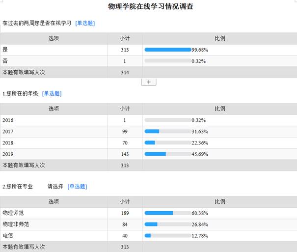 线上教学两周后,设计问卷,调查在线学习状况,获得有效数据三百多条,为授课教师提供参考依据。传递正能量,采访线上教学优秀教师,在学院微信公众号上每周推送线上教学优秀教师案例给员工,让员工们了解老师在线教学的真实状态。