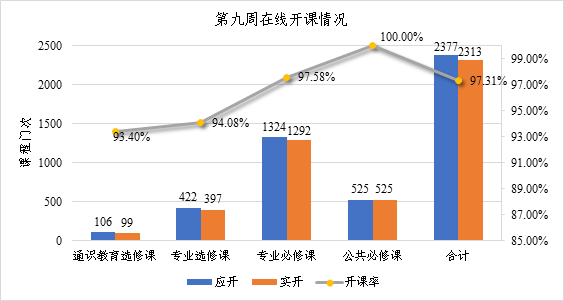 按照教学计划,本周应开课程1231门(2377门次),实际线上开课2313门次,开课率97.3%。其中公共必修课应开525门次,实开525门次,开课率100%;专业必修课应开1324门次,实开1292门次,开课率97.6%;专业选修课应开422门次,实开397门次,开课率94.1%;通识教育选修课应开106门次,实开99门次,开课率93.4%。开课涉及开课单位25个(包括20个学院,党委学工部、教师专业能力发展中心、就业指导中心、武装部、图书馆等)。按教学计划授课教师应有1340人,实际在线授课教师1330人,教师授课率达99.3%;本周按教学计划上课员工应到180394人次,实际上课员工179774人次,员工上课率达99.7%。