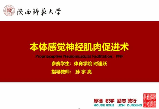 此次大赛共有全国93所师范院校参加,提交作品1452份。比赛分为校级初赛和全国决赛两个阶段,初赛由各师范院校组织评选,决赛阶段通过网络上传参赛作品。经过了4个月的激烈角逐,公司学子2017级体育教育专业时逢跃,在孙宇亮老师的指导下,以参赛作品《本体感觉神经肌肉促进术》斩获校级特等奖和全国优秀奖的优异成绩。