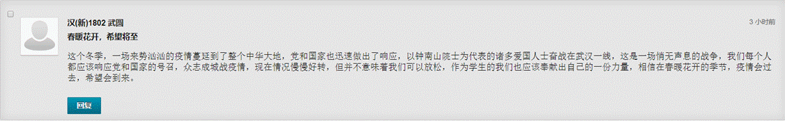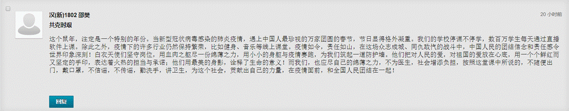 历史文化学院 家处湖北的2016级历史学创新实验班员工雷雨生的肺腑之言:这是一堂很特别也很有启发的思政课,在这样一个历史性的时刻,四位重量级讲者的分享也启发我去记录身边正在发生的历史、面对我们共同经历的时代、反思进步前行的经验。正如几位讲者所说的那样,面对这场突如其来的大疫,我们从一声声“山川异域,风月同天”、一次次公义的国际援助中更加深刻地体会到全球命运共同体的意涵;也从高效率的工程建设、物资配给、社区管理等方面进一步感受社会主义制度的优越性和祖国的强盛;更从前线活跃着的年轻身影中坚定了对这片土地未来的希望。这个假期,待在湖北家中,每天牵挂着关于疫情的最新消息,为了一点点好的进展而欢欣鼓舞,也从最初的恐惧与焦虑中看到光明与希望。也许正因为身在湖北,感同身受着大国的担当、生命的坚韧,我相信这场大疫将在我身上留下更加深刻而难以磨灭的印迹,启迪我用信念、热爱和奋斗去追寻美好的价值,去创造生命的意义。就像鲁迅先生在《我之节烈观》中所写的那样:“我们还要发愿:要自己和别人,都纯洁聪明勇猛向上;要人类都受正当的幸福。”