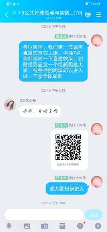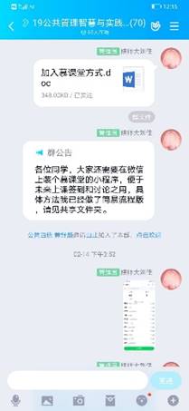 首先,依托中国大学MOOC资源,刘佳老师精心挑选与本课程内容相近的国家精品在线开放课程《公共管理学》,对教学内容修改完善后建立了异步SPOC课程。同时采用慕课堂小程序进行课堂签名、问卷调查、课堂练习和讨论等教学课堂互动环节,利用腾讯课堂直播实施教学内容拓展、案例分析、课程答疑等教学环节,并配合分享屏幕播放课件、实时共享课程数据等渠道保证师生的思维同步。