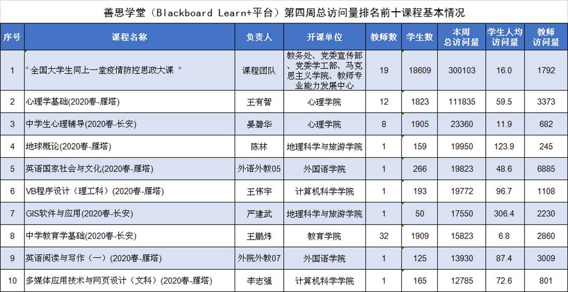依托善思学堂(Blackboard Learn+平台)开展在线教学课程500门次。每门课程平均访问量2145人次,较上周增长297人次,其中本周访问量排名第一的课程为本周新开课程“全国老员工同上一堂疫情防控思政大课”,访问量达30万余次。本周访问量前十的课程授课信息如下表: