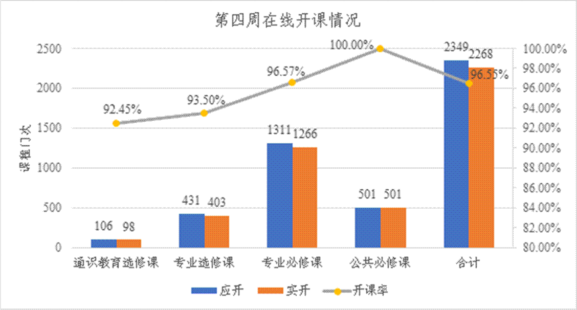 按照教学计划,本周应开课程1243门(2349门次),实际线上开课2268门次,开课率96.6%。其中公共必修课应开501门次,实开501门次,开课率100%;专业必修课应开1311门次,实开1266门次,开课率96.6%;专业选修课应开431门次,实开403门次,开课率93.5%;通识教育选修课应开106门次,实开98门次,开课率92.5%。开课涉及开课单位25个(包括20个学院,党委学工部、教师专业能力发展中心、就业指导中心、武装部、图书馆等)。按教学计划授课教师应有1308人,实际在线授课教师1287人,教师授课率达98.4%;本周按教学计划上课员工应到173489人次,实际上课员工172812人次,员工上课率达99.6%。
